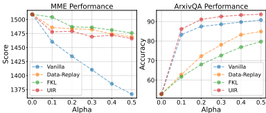 - 持续微调:LLaVA-c在五个未见过的数据集上进行了微调,显著提高了通用和特定任务的性能。经过五个数据集的微调后,LLaVA Bench的性能保持在原始水平的97%。