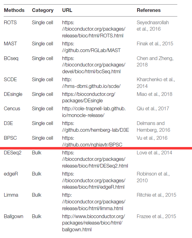 红线上方是专门针对单细胞测序数据开发的差异表达分析软件或R包,红色下方是针对bulk转录组数据开发的软件或R包