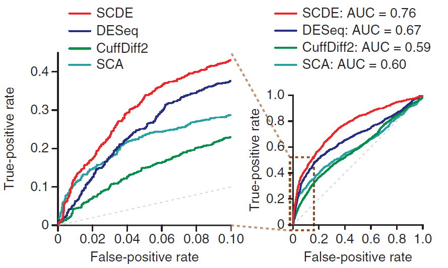 图2、SCDE与其他软件在单细胞测序数据集上鉴定差异表达基因的性能比较(Kharchenko et al. Nature Methods, 2014)