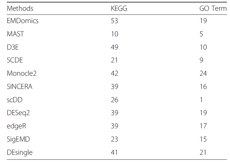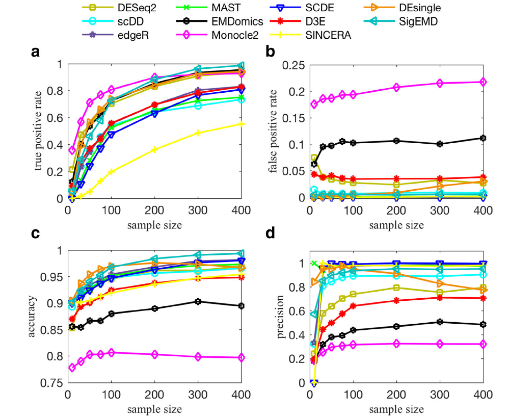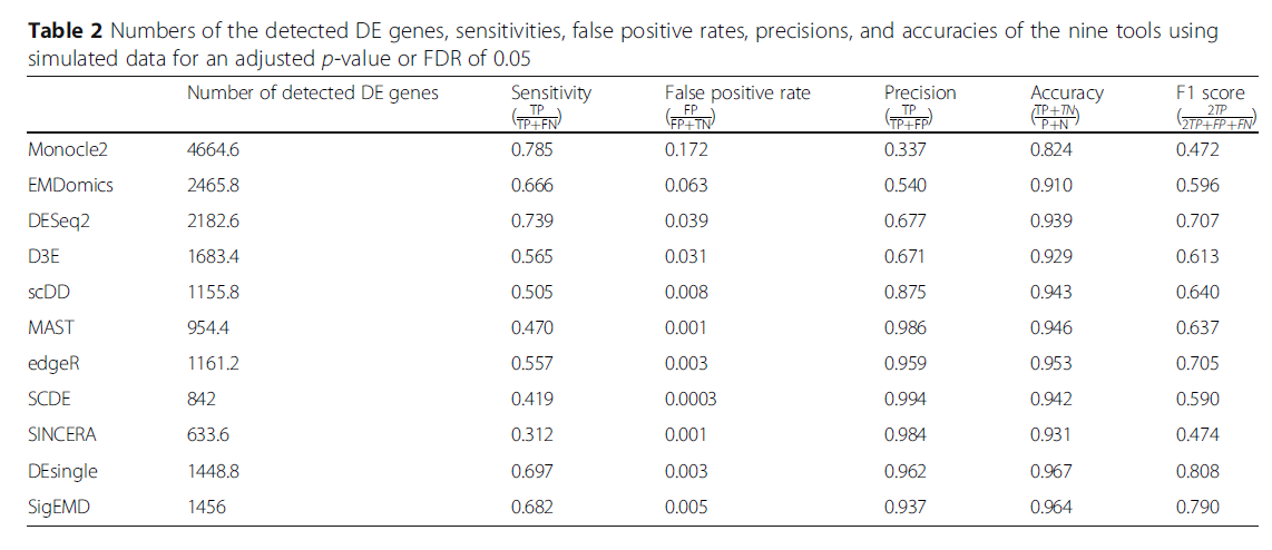 这里要值得提一下SCDE(全名:Single Cell Differential Expression)软件,其属于最早一批专门针对单细胞测序数据开发的差异表达分析软件,地址为:https://hms-dbmi.github.io/scde/。下图是原文章中SCDE与其他传统差异表达分析软件的性能比较,显示SCDE具有不错的性能。