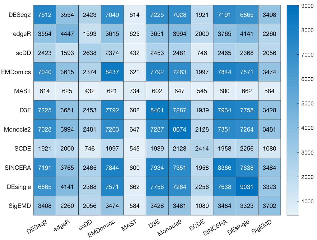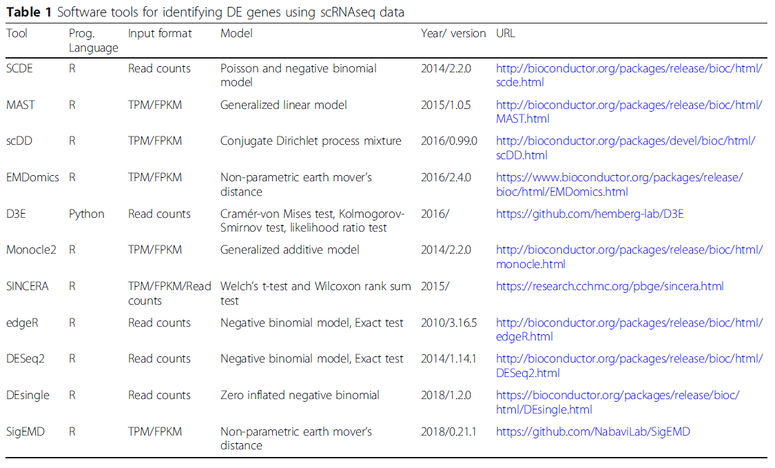 最近,Wang et al.等人比较了11款经典的软件在单细胞测序测序数据集上的差异表达分析性能,这些软件具体如下表所示: