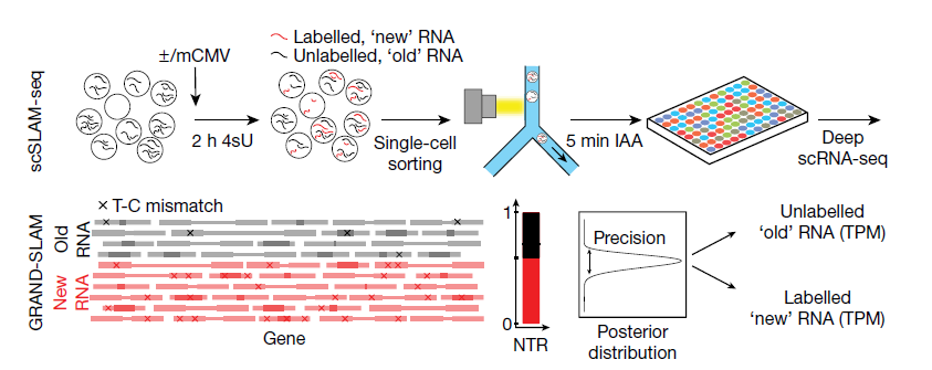单细胞转录组测序(single-cell RNA-seq, scRNA-seq)强调了细胞间表达异质性在健康和疾病表型变异中的重要作用。然而,目前的scRNA-seq方法仅仅提供了基因表达的一个快照,很少传达关于转录的真实时间动态和随机特性的信息。scRNA-seq分析的另一个关键限制是每个细胞的RNA图谱只能分析一次。原文作者开发了单细胞巯基连接的RNA烷基化代谢标记测序技术scSLAM-seq,它整合了代谢RNA标记、生化核苷转化和scRNA-seq,通过区分每个单细胞数千个基因的新老RNA来直接记录转录活性。通过使用scSLAM-seq来研究裂解性巨细胞病毒在单个小鼠成纤维细胞中的感染情况。从旧RNA推断出的细胞周期状态和感染剂量使得能够基于新RNA进行剂量反应分析。因此,scSLAM-seq既可视化又解释了单细胞水平转录活性的差异。此外,scSLAM-seq描述了宿主基因表达中的“开-关”控制和转录动力学,以及与启动子内在特征(BP–TATA-box相互作用和DNA甲基化)相关的广泛基因特异性差异。因此,基因特异性而非细胞特异性的特征解释了单个细胞之间的转录组异质性和转录对扰动的反应。