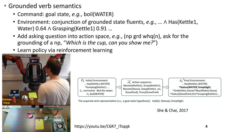 近些年来,类似于SHRDLU的想法,学者通过强化学习的方法,使得计算机能够接收一段复杂的语言指令,并完成复杂虚拟空间或真实空间的导航和操作任务,一般称为指令跟从(instruction following)或空间推理(spatial reasoning)。比如在教机器人新技能中,She & Chai通过将人说话的指令、环境状态和机器动作表达为谓词逻辑形式,在人机互动中使用强化学习的方式,使得机器人学习到完成任务的最优策略(She & Chai, 2017)。