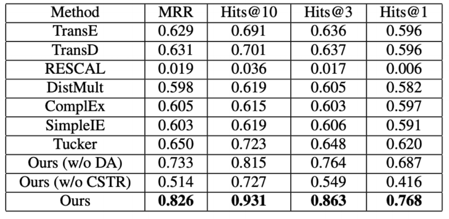 与经典的知识图谱嵌入方法TransE, TransD, RESCAL, DistMult, ComplEx, SimplE, Tucker在三元组分类和链接预测上进行对比,以下是对比结果: