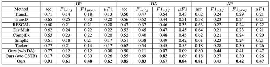 由于物理常识学习的知识图谱补全与其他知识图谱补全相比有自己的特殊之处,讲者针对物理常识学习添加了两个必要的约束——类型约束和否定关系。类型约束的目的是去除不可能的关系,比如对于一个样本(A,B),只有当A属于物体类,B属于属性类,(A,B)才有可能有物体属性这样一个关系。面对物理常识关系条目较少的问题,讲者通过引入否定关系增加关系数量,同时也可以利用在文本中出现的否定关系作为训练样本,比如(person, NOT-OP, a_tool),即人不是工具。