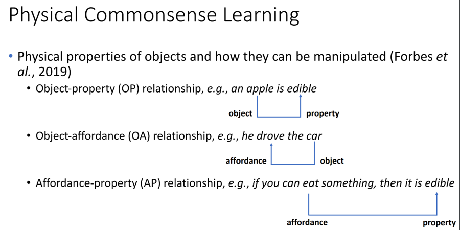首先需要明确的是物理常识是什么?根据Forbes等人的定义,物理常识指的是物体的物理性质以及如何操作它们,具体包括三个子任务:物体属性关系(object property)、物体功能关系(object affordance)和功能属性关系(affordance property)。