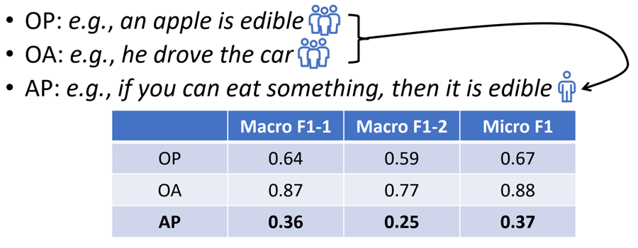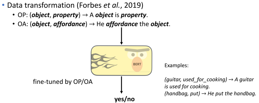 通过语言进行的人机交互是一种比较自然的方式,并且目前大多数自然语言处理技术强依赖于神经网络。然而,Forbes等人在CogSci 2019的一篇文章中指出,神经网络模型并不能很好的学习物理常识。虽然对于文本中常见的物体属性关系和物体功能关系,像预训练模型BERT这样的大规模神经网络模型能够有较好的预测效果,但对于需要一定推理能力的功能属性关系,BERT并不能做很好的预测。一般认为,像BERT这样的神经网络模型仅仅能够学习文本中显式存在的关联关系。