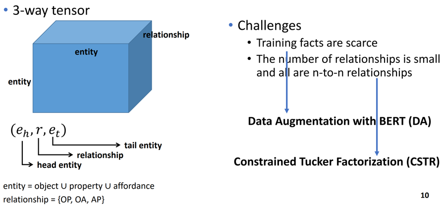 由于BERT在预测物体属性关系和物体功能关系上都有较好的效果,那么能不能通过物体属性关系和物体功能关系的预测来提升对功能属性关系预测的性能,从而提升模型的泛化能力呢?讲者将物理常识学习描述成为了一个知识图谱补全的问题,通过张量分解的方法,隐式的建模物体属性关系、物体功能关系和功能属性关系三者之间的联系,从而提升功能属性关系的预测性能。相比于一般的知识图谱补全问题,物理常识的知识图谱面临两个挑战: