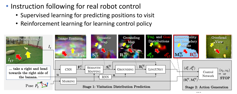 进一步,Blukls等使用两阶段的学习方法,首先通过监督学习获得从文本和图像相对应的目标概率图,然后根据该概率图使用深度强化学习的方法学习控制机器人策略网络,从而使机器人可以理解语义信息更加丰富的指令,并在真实环境中执行更加复杂的操作(Blukls et al, 2019)。