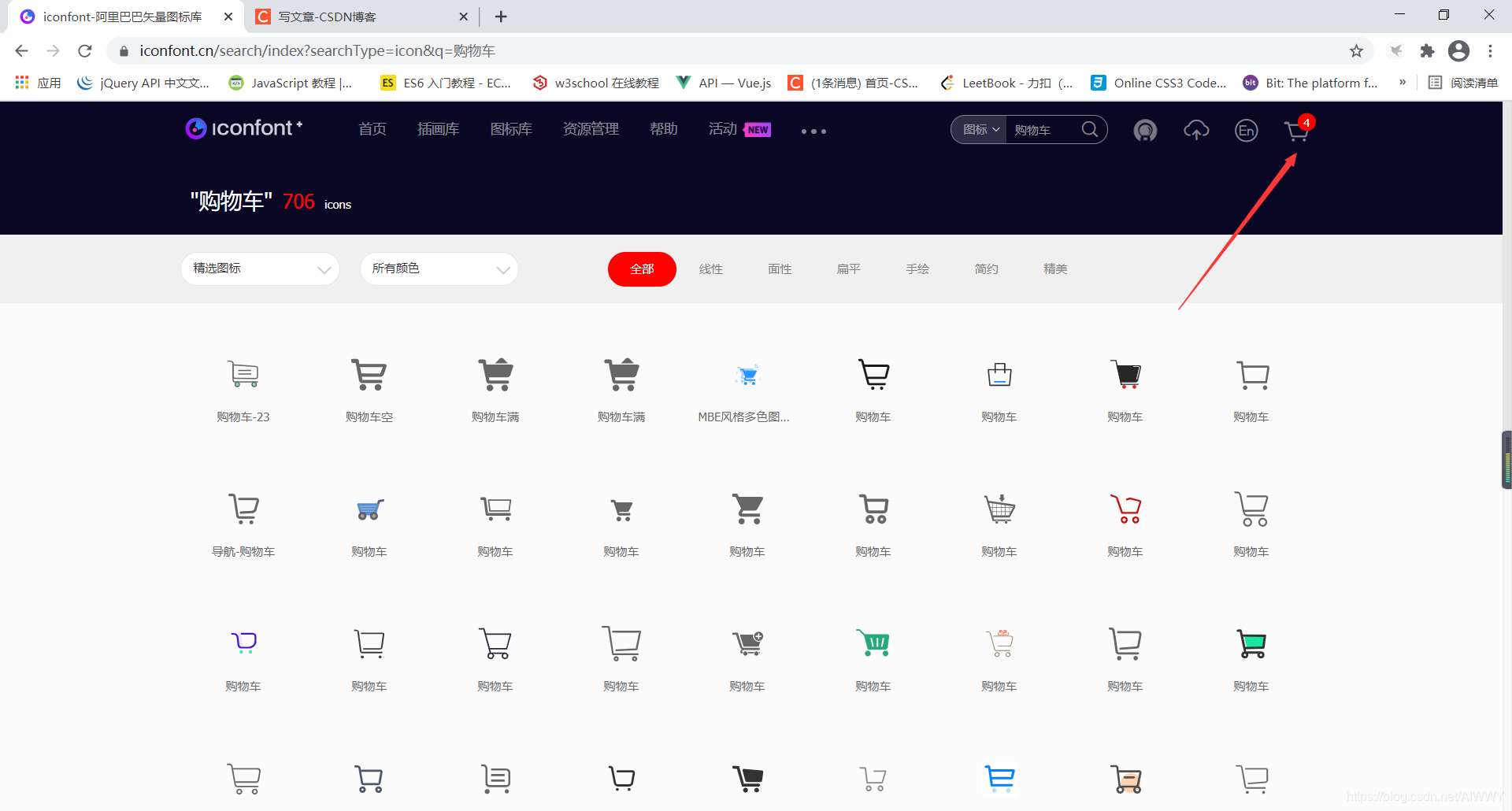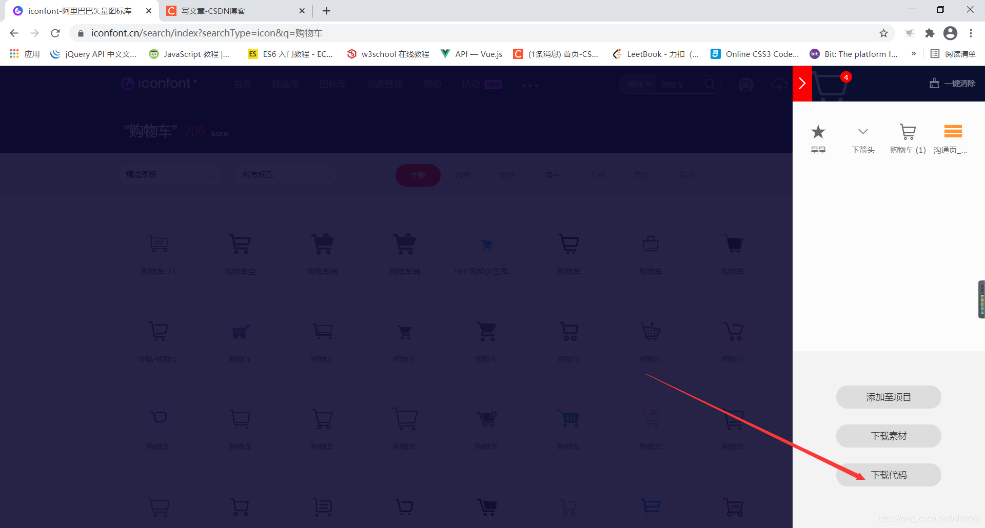 登陆注册上面网站,将想要使用的图标加入收藏夹,点击购物车再点击下载代码,如下图所示