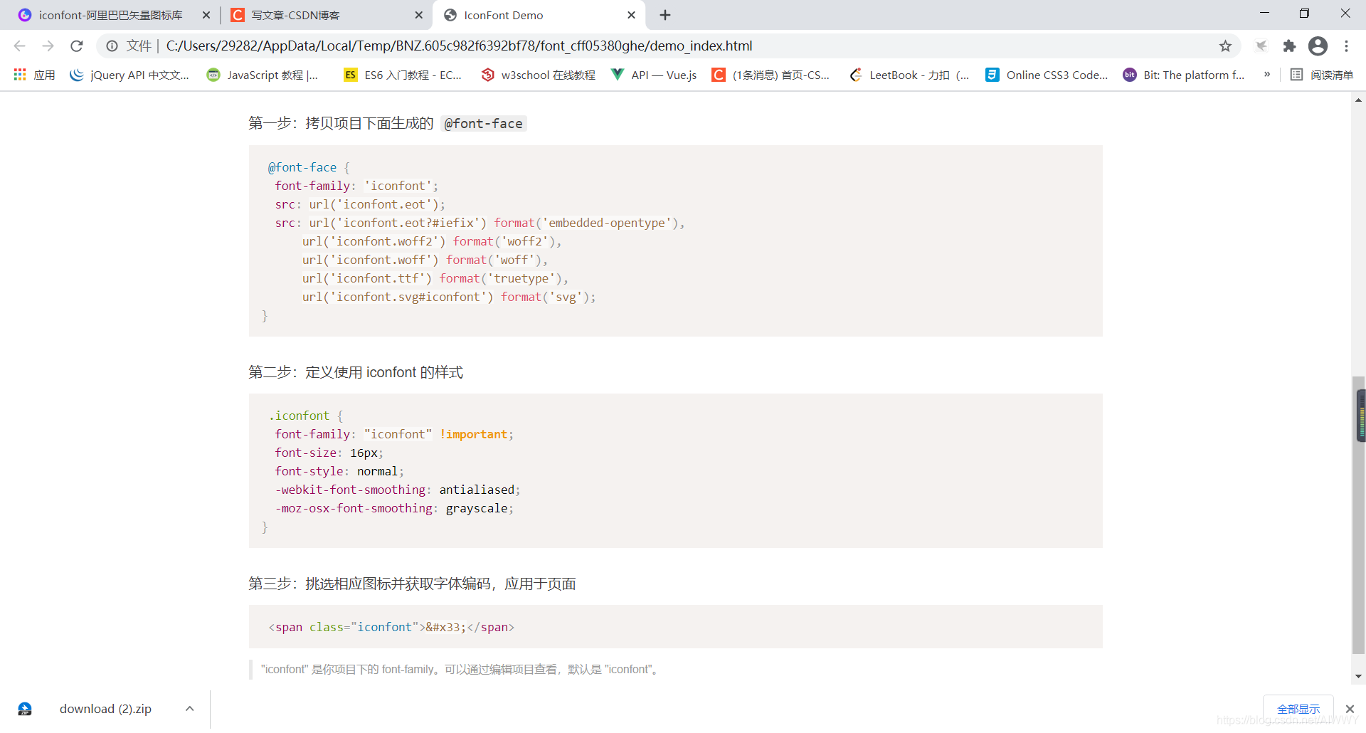 然后打开解压的下载文件,打开后缀名为html的文件,会介绍三种使用方法为分别是通过Unicode、Font class和Symbol引用,我们这里介绍第一种如图: