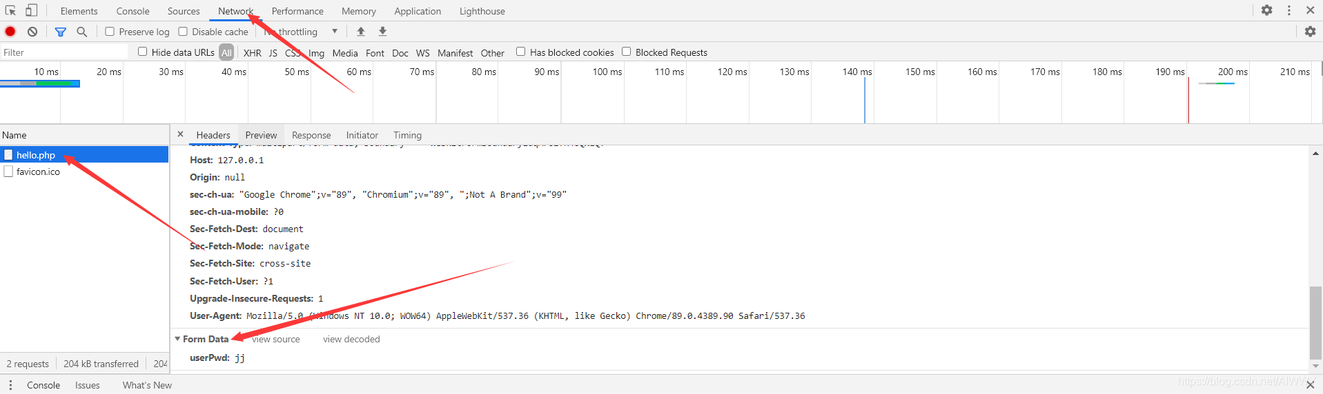 存储在请求头中,如图所示,打开我们的控制台中的Network,找到我们请求发送数据的地址,图中为hello.php,在Headers请求头中最下面Form Data为我们发送的数据内容,图中为userPwd:jj。