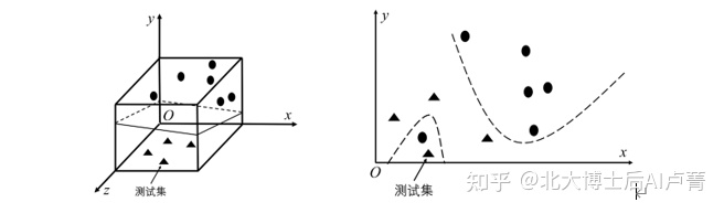 在机器学习中,分类器为特征空间中的一条线(在高维空间中为一个面,具体形状取决于所用分类器和维度),训练过程就是调整线(面)的位置和形状,使其在训练集上尽可能准确。训练数据越多、越密,分类线越不容易被极端特例影响,学到的是具有普遍性的规律;训练数据越少,或者说数据分布越稀疏,分类器越容易学到特例,从而产生过拟合。