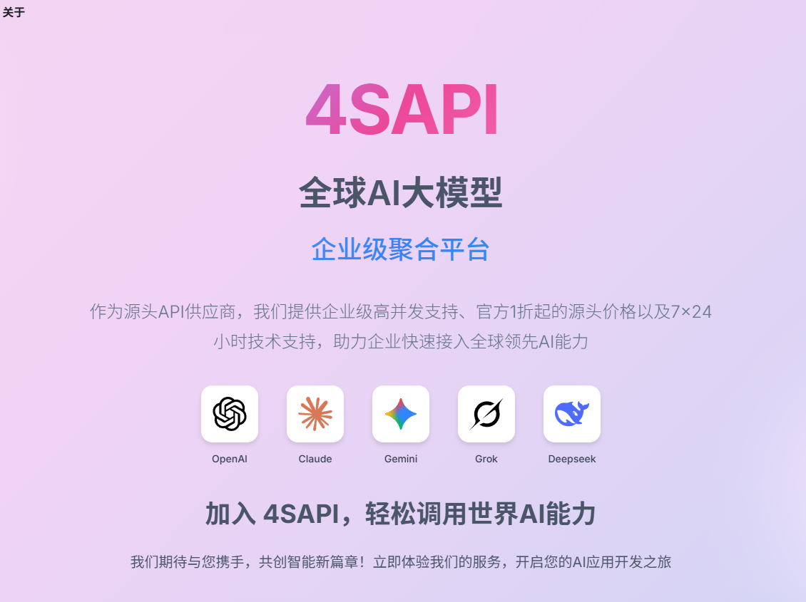 2. 合规中转解决方案:4SAPI 聚合服务 4SAPI 定位为企业级大模型聚合平台,通过官方直连通道提供 Claude API 中转服务,具备以下核心优势: