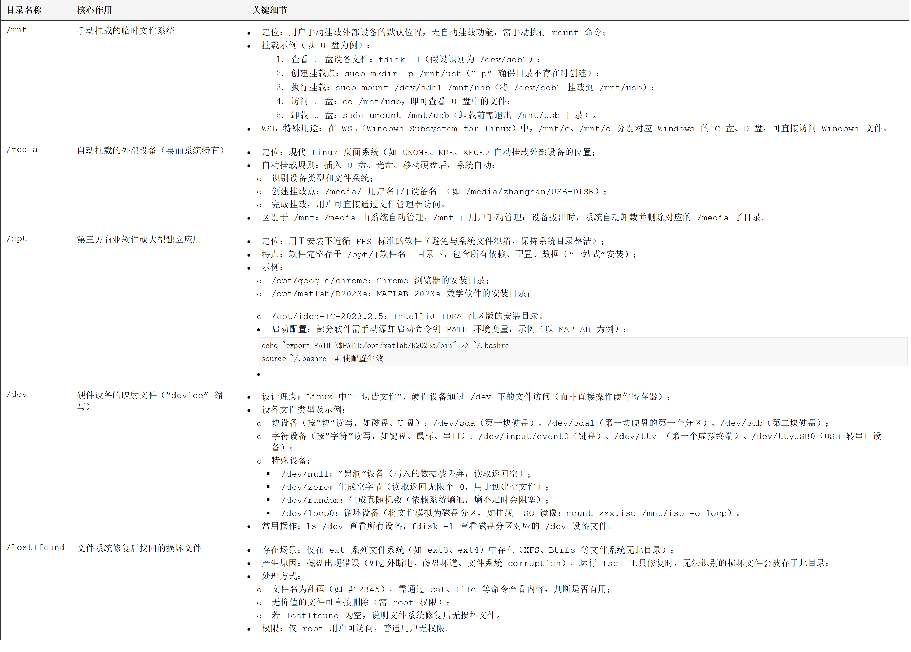 此类目录是外部存储设备(硬盘分区、U盘、网络存储)的“挂载点”,遵循 Linux “一切皆文件” 的设计理念,通过目录访问外部设备内容。