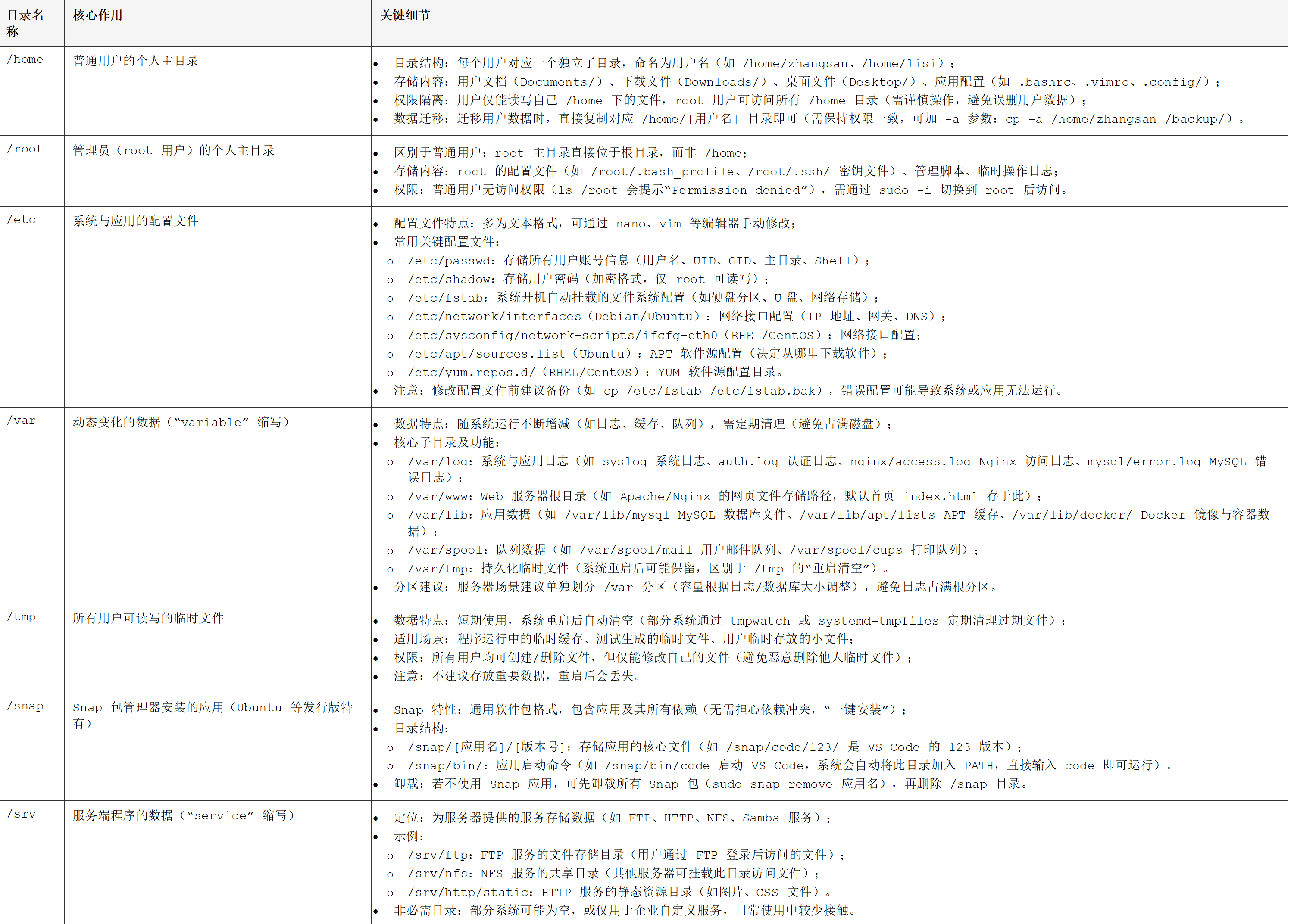 - 静态与动态分离:静态配置文件(/etc,内容长期不变)与动态数据(/var 日志、/tmp 临时文件,内容随运行变化)分离,既保证配置稳定,又便于动态数据的清理与管理(如定期删除日志)。