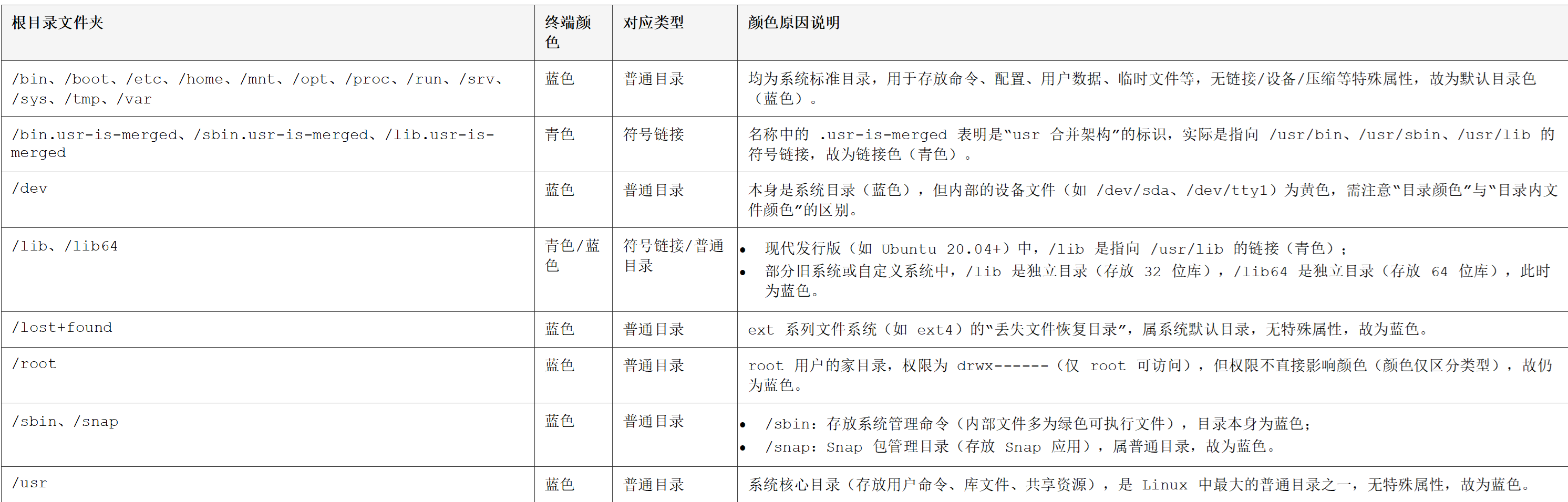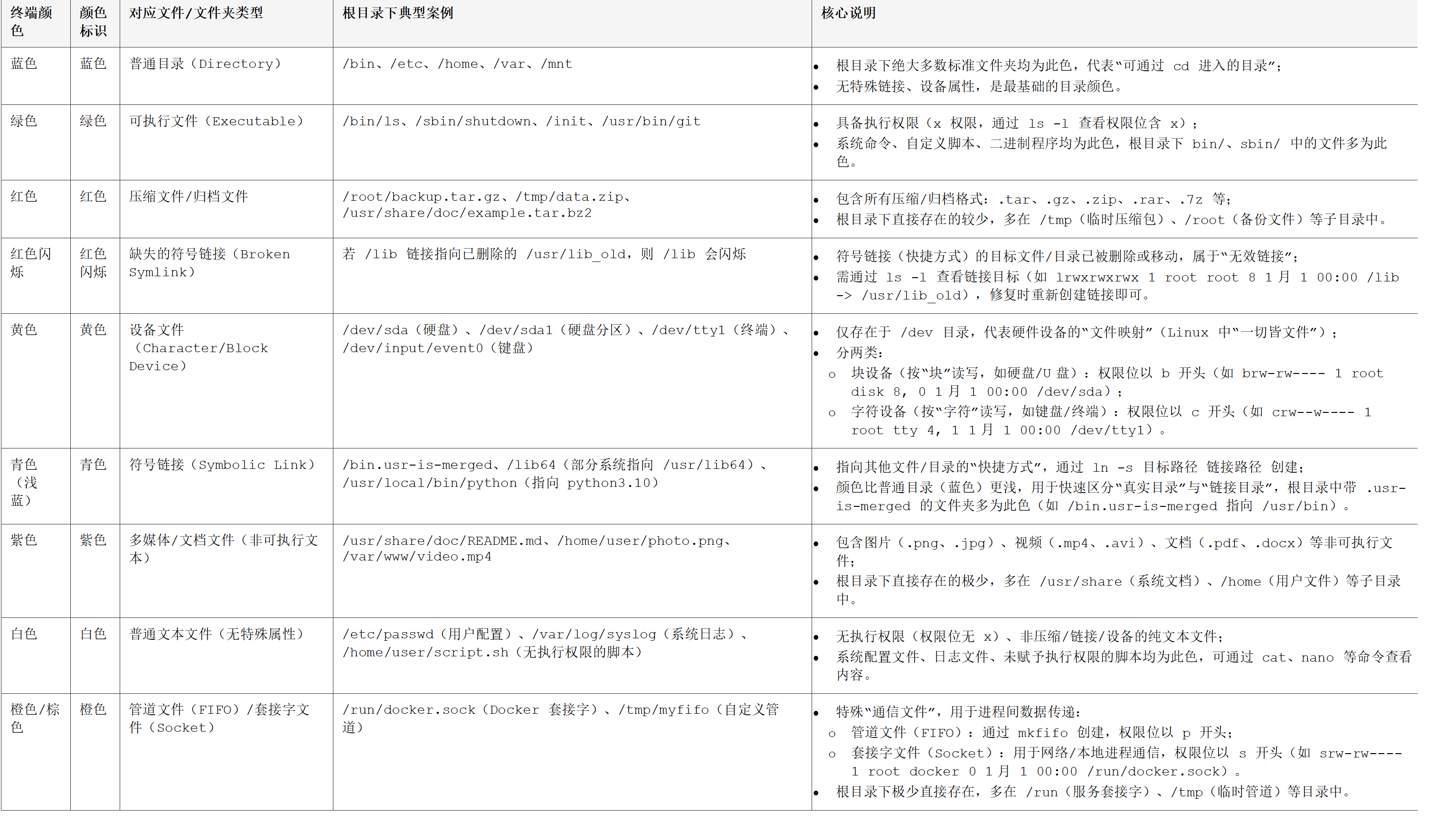 Linux 根目录文件夹/文件颜色含义说明