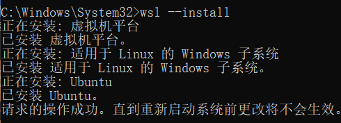 wsl --install命令,然后按回车键。此命令会自动启用运行 WSL 所需的功能,并安装默认的 Ubuntu 发行版。如图所示,表示下载安装完成了。