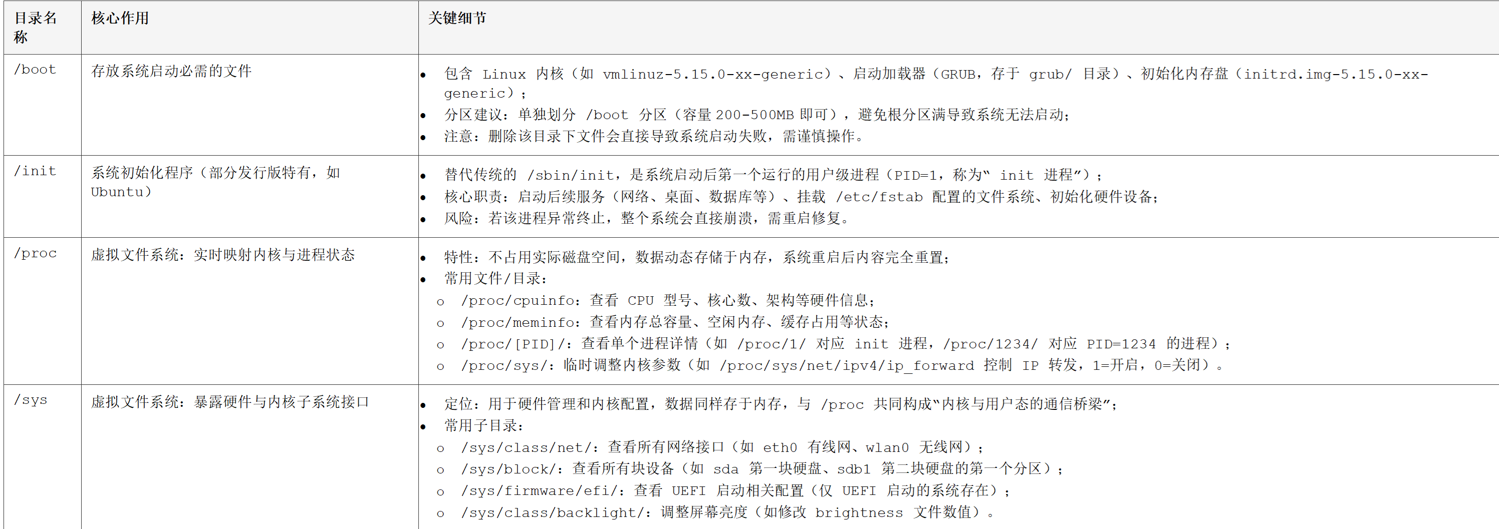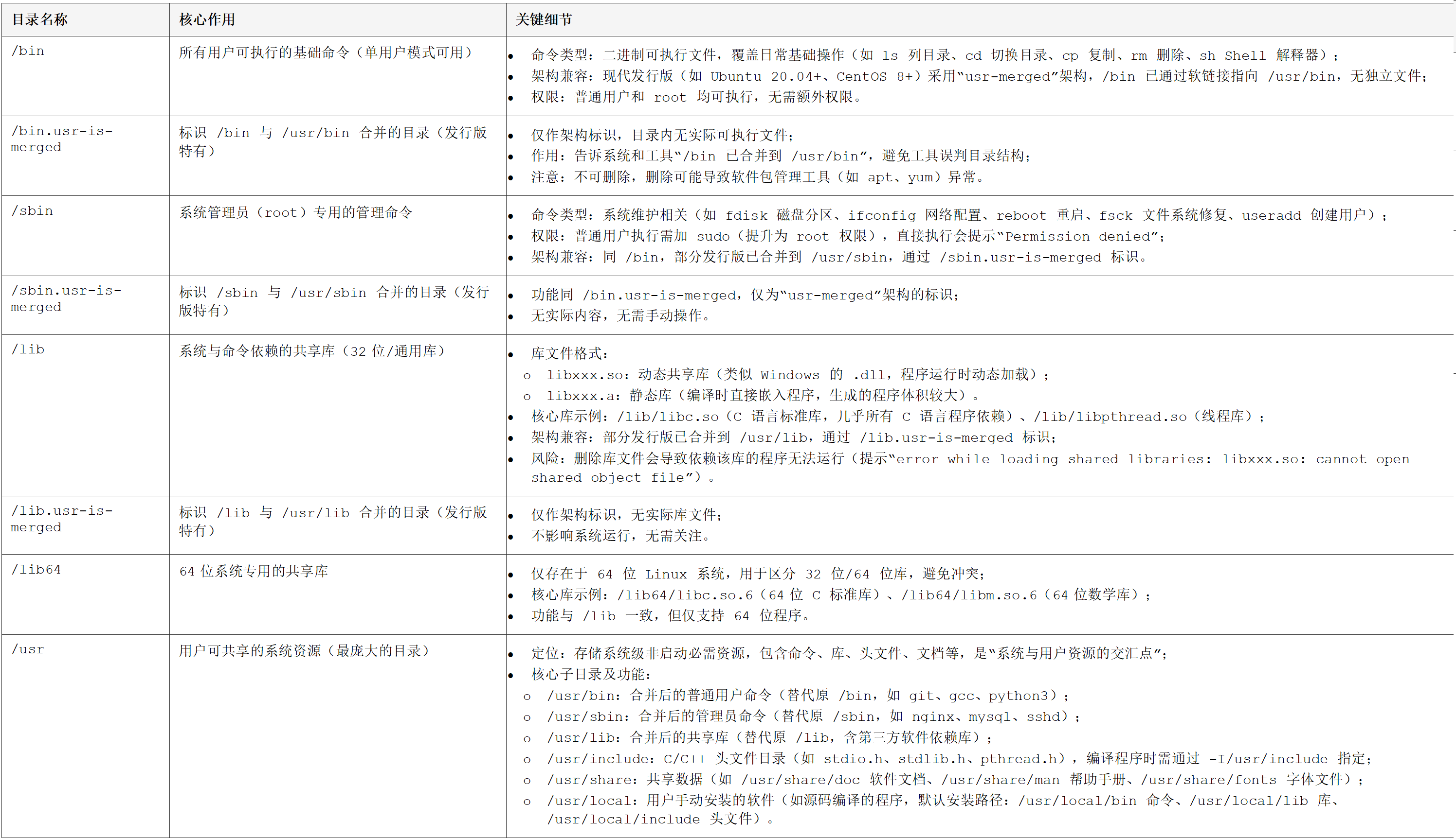 本文档基于 Filesystem Hierarchy Standard (FHS) 标准,详细说明 Linux 根目录下所有核心目录的功能、关键细节及使用场景,适用于 Linux 系统学习、开发与日常运维参考。