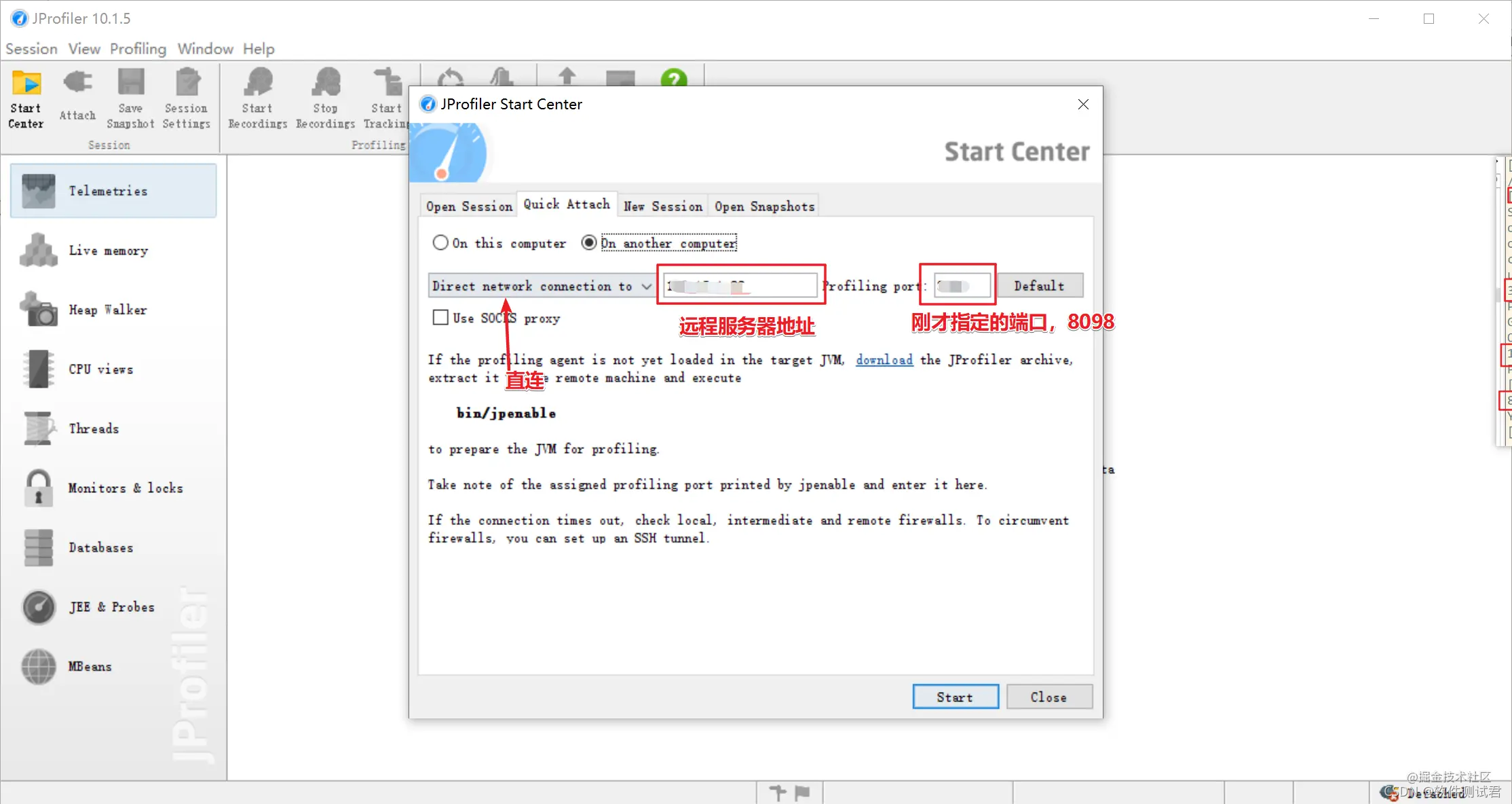 配置好上文列出的 JMeter 插件和配置以后,我们已经可以拿到应用的 TPS 和所对应的服务器资源情况。但如果此时发现程序性能有问题,我们还少个观察、监控应用的功能,来分析性能瓶颈,这里我们选择了 JProfiler