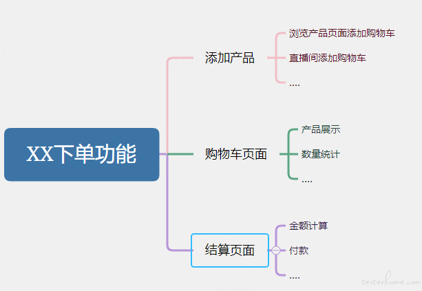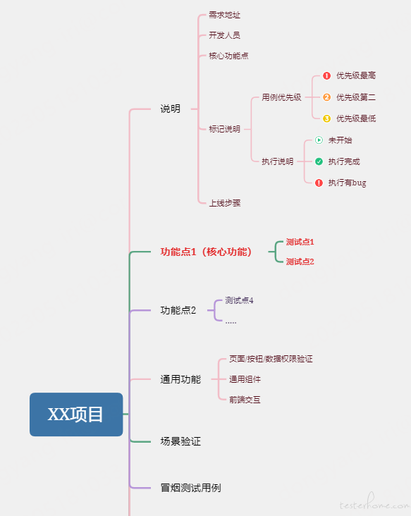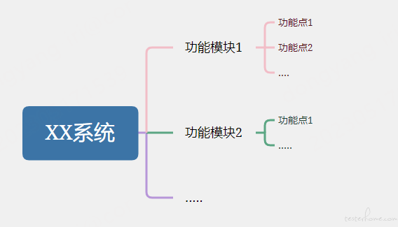 比如,系统级的测试,建议xmind一级菜单按照功能模块拆分,再针对每个功能模块分别展开用例编写:
