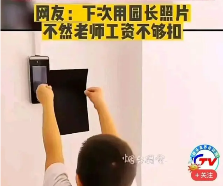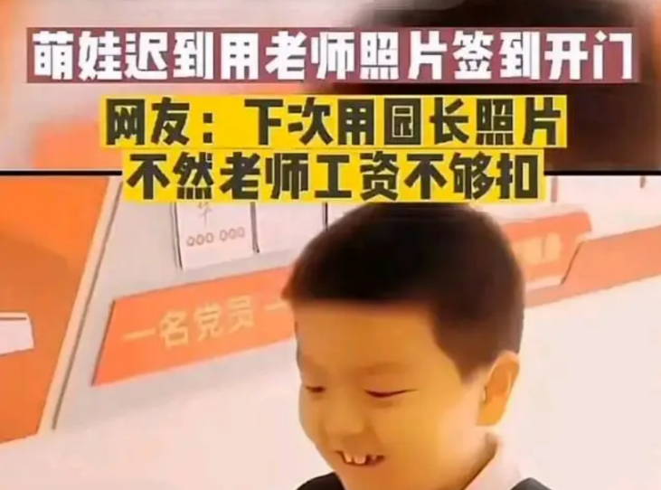 事情是这样的,有一个幼儿园小朋友去上学了,自己迟到了不能进去,但是又不想被老师知道,于是乎,就从幼儿园的墙壁上撕下来自己老师的照片,然后举着老师的照片到打卡机面前,居然就签到成功,然后门开了就进去了,而且过程因为够不到打开机,还尝试了几次呢。老师教的确实挺好的,不止是文化课那么简单,社会实践课也一并教了。