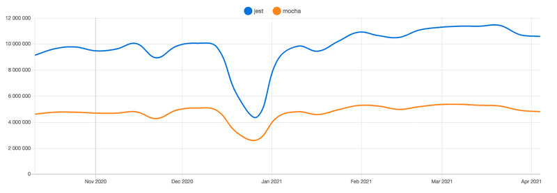 上面显示了两个npm模块的下载量随时间变化的趋势。可以看到,Jest的地位远超Macha,其每周的下载量几乎是Mocha的两倍。不过,Mocha与Jest的市场定位不同,它更成熟,可靠性高,所提供的解决方案也更加紧凑。