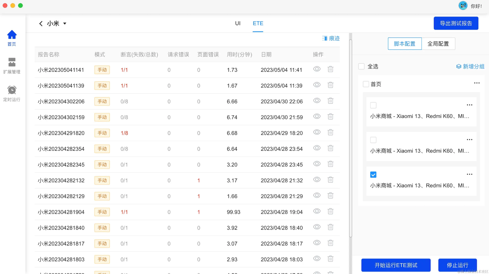 测试脚本录制好了,怎么跑自动化测试呢?这是个问题,虽不难但也不想使用过于麻烦的启动方式,为了满足这个条件,那我们就要开发一个开箱即用,并支持跨端的工具,说到这里electron好像是个不错的选择,那我之前的不务正业好像都派上用场了,那就基于electron开发自动化测试工具吧,只要将测试脚本导入工具,点击一下按钮就可以跑测试自动化了,有没有感觉自动化测试好简单,而且生成的测试报告,让你对测试结果一目了然,为了方便维护测试用例脚本,工具支持拖拽、分组,单选等功能,方便你随意所欲测试,如果你还想要推送消息,那也不打紧,可以通过配置飞书,钉钉消息推送,保证你随时随地都可以掌握测试状况,即使你线上正常运行的项目,也可以通过定时任务跑自动化,当做一个线上项目监控平台也不错哇!!!🤩