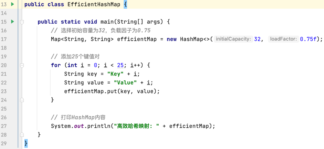 这段代码演示了如何在Java中使用HashMap,并在创建HashMap时指定了初始容量和负载因子。通过这种方式,我们可以更好地控制HashMap的性能。