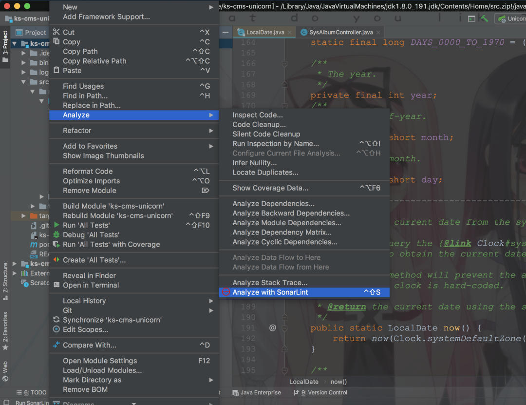 或者选中文件或目录,点击菜单栏 Analyze -> Analyze with SonarLint