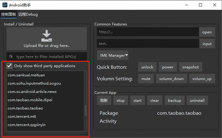 有些同学还不清楚我们如何获取我们想要的应用包名,点击AirtestIDE上自带的Android小助手可以查询,有关更多关于Android小助手的用法,可以点击查看我们的教程文档: