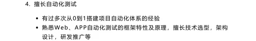 在技能分解中,B哥着重描述了0~1搭建自动化体系的经验,这一点忒吃香!因为现在大多数公司要求面试者具备自动化的能力,但真正做过多个完整项目自动化测试人才特别少,更何况还是像B哥这样有从0到1搭建经验的人。