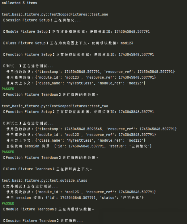 @pytest.mark.usefixtures("class_context")class TestScopedFixtures:def test_one(self, function_specific_data, module_data, class_context):print("\n【测试一】正在运行测试...")print(f" 使用函数数据:{function_specific_data}")print(f" 使用模块数据:{module_data}")print(f" 使用类上下文:{class_context}")assert function_specific_data is not Noneassert module_data is not Noneassert class_context is not None# 验证 Fixture 依赖关系 (间接验证作用域)assert function_specific_data["resource_ref"] == module_data["resource_ref"]assert module_data["module_id"] == class_context["module_ref"]def test_two(self, function_specific_data, module_data, class_context, expensive_resource):print("\n【测试二】正在运行测试...")print(f" 使用函数数据:{function_specific_data}")print(f" 使用模块数据:{module_data}")print(f" 使用类上下文:{class_context}")print(f" 直接使用 session 资源:{expensive_resource}")assert function_specific_data is not None# 验证不同函数的 function_specific_data 不同# (很难直接验证,但可以通过打印的 timestamp 或 id 观察)assert expensive_resource["status"] == "已初始化"