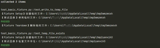 # test_basic_fixture.pyimport pytestimport tempfileimport os# 定义一个简单的 Fixture@pytest.fixturedef temp_file_path():"""创建一个临时文件并返回其路径"""# Setup: 创建临时文件fd, path = tempfile.mkstemp()print(f"\n【Fixture Setup】创建临时文件:{path}")os.close(fd) # 关闭文件描述符,仅保留路径# 将路径提供给测试函数yield path # 注意这里使用了 yield,稍后会详细解释# Teardown: 删除临时文件print(f"\n【Fixture Teardown】删除临时文件:{path}")if os.path.exists(path):os.remove(path)# 测试函数通过参数名 'temp_file_path' 来请求使用这个 Fixturedef test_write_to_temp_file(temp_file_path):"""测试向临时文件写入内容"""print(f"【测试函数】使用临时文件:{temp_file_path}")assert os.path.exists(temp_file_path)with open(temp_file_path, 'w') as f:f.write("你好,Pytest Fixture!")with open(temp_file_path, 'r') as f:content = f.read()assert content == "你好,Pytest Fixture!"def test_temp_file_exists(temp_file_path):"""另一个测试,也使用同一个 Fixture"""print(f"【测试函数】检查文件存在:{temp_file_path}")assert os.path.exists(temp_file_path)