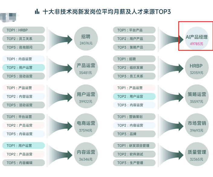 报告中指出,2025年1-2月,观察新发岗位量最多的10个非技术岗的人才来源情况,其中,AI产品经理以49785元的月薪领跑其他岗位。