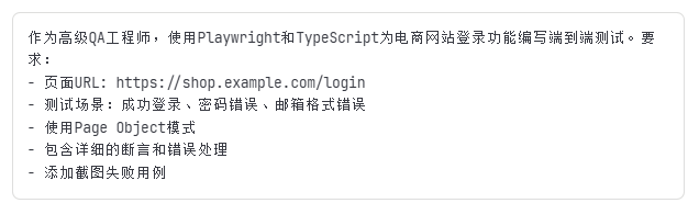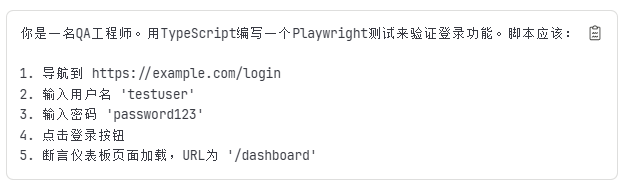 你可以提示AI根据场景生成完整的Playwright或Cypress测试,而不是手动编写代码。