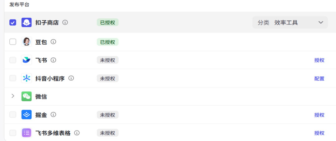 你可以将在Coze上创建的智能体部署到不同的社交平台和消息应用上,例如豆包、飞书、扣子官方商店、抖音小程序、微信、掘金等。