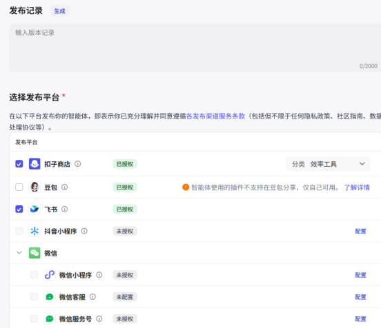 • 你只需要在Coze的发布页面选择想要的平台,然后按照指引完成部署的步骤。你也可以通过Coze提供的Webhook和SDK功能将智能体部署到自己的网站或应用上。