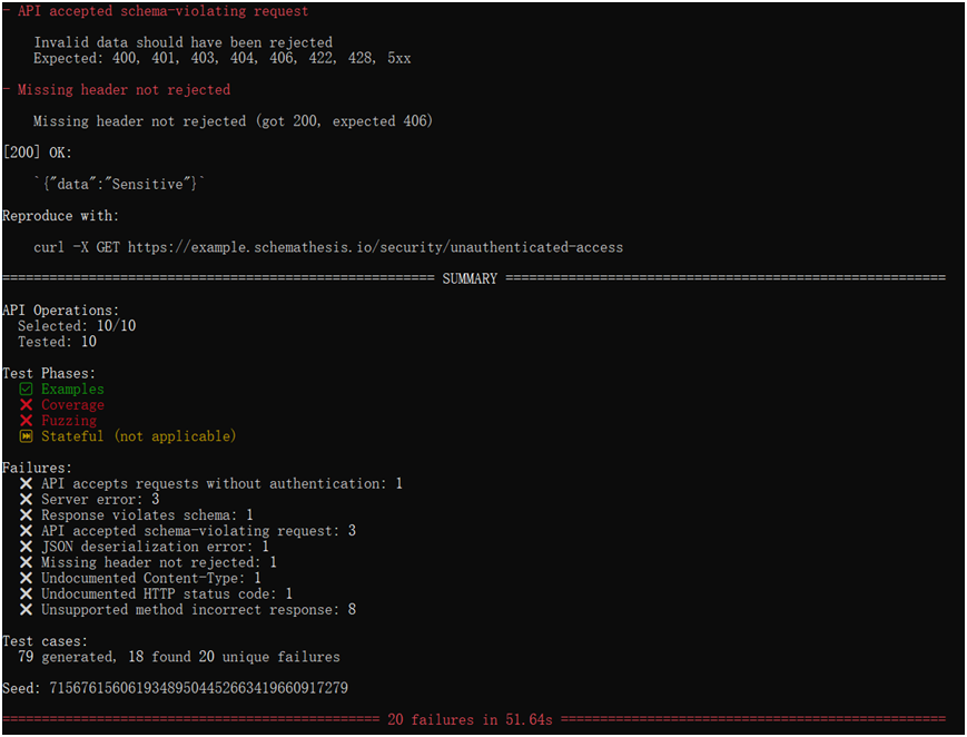 自动生成测试用例,检测API中的500错误、schema违规、验证绕过和集成失败等问题。