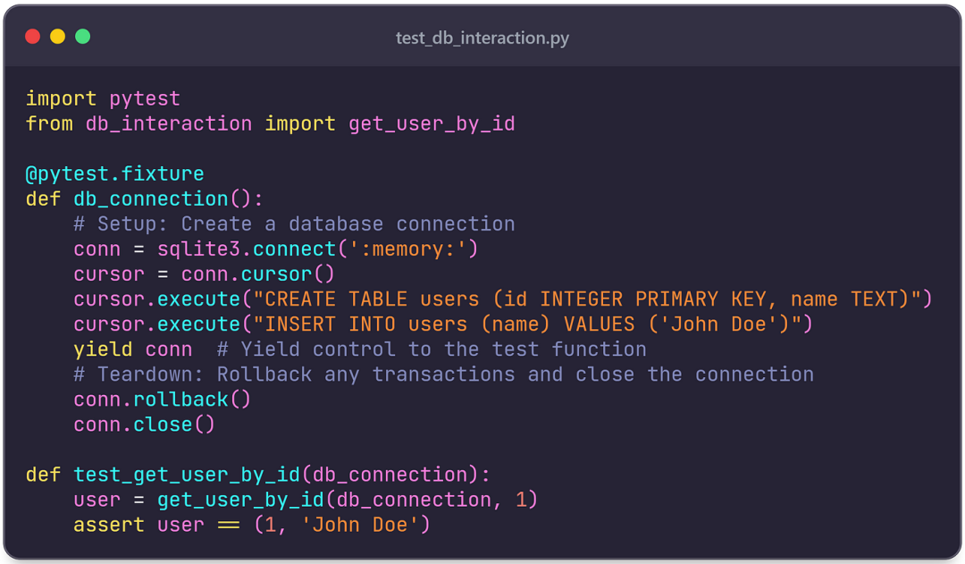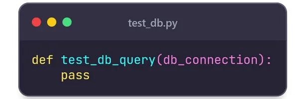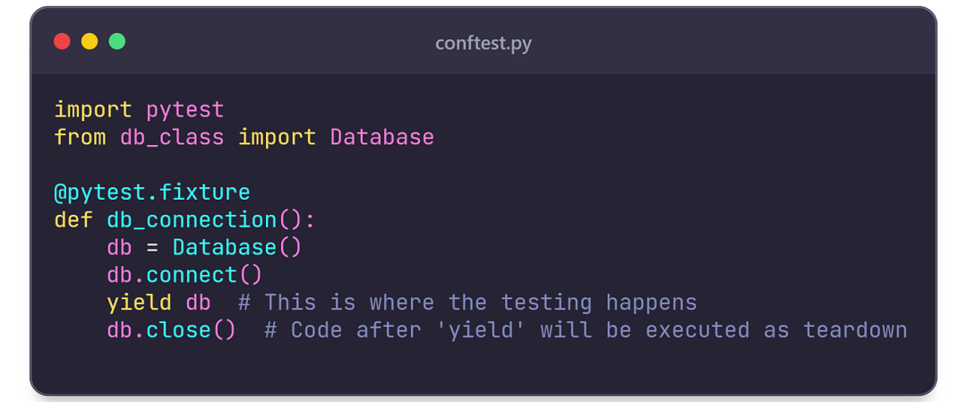 在此示例中,db_connection夹具处理创建新对象并连接到数据库的设置Database,以及在测试函数执行后关闭数据库连接的拆卸。