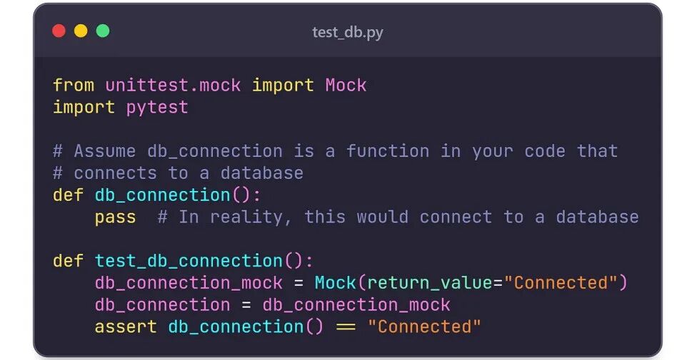 模拟是另一个高级功能,可以在测试期间模拟行为,这对于将测试与外部因素或系统隔离非常有用。该unittest.mock库包含在 Python 中,可以与 pytest 一起使用来创建模拟。