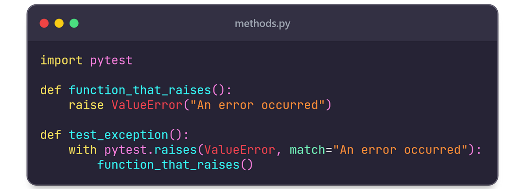 测试代码如何处理异常对于构建健壮的应用程序至关重要。Pytest 简化了这个过程。以下是测试函数是否引发预期异常的方法: