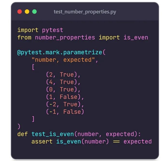 要测试该is_even函数,您可以使用参数化来验证其在一系列数字上的正确性: