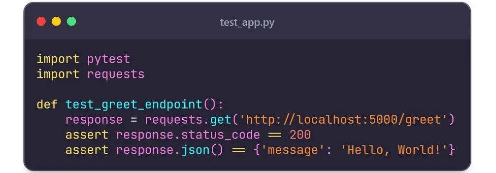 使用REST API时,测试端点的预期行为至关重要。让我们考虑一个简化的场景,其中您有一个 Flask 应用程序,该应用程序具有返回问候语的单个端点: