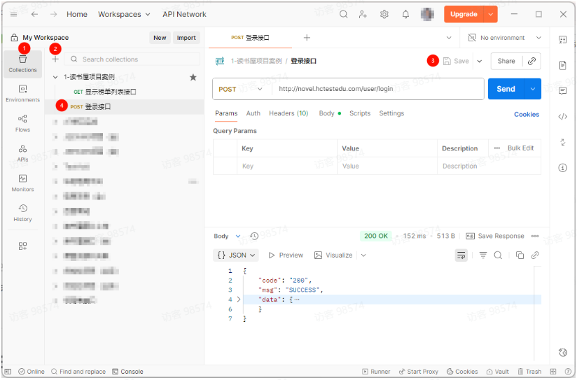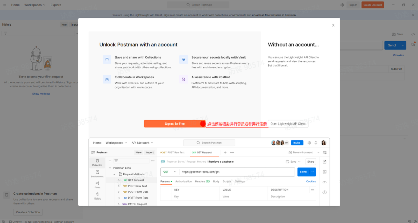 如下图,按照提示去进行登录或者注册即可。【Postman有时候会有点慢,多尝试几次。】