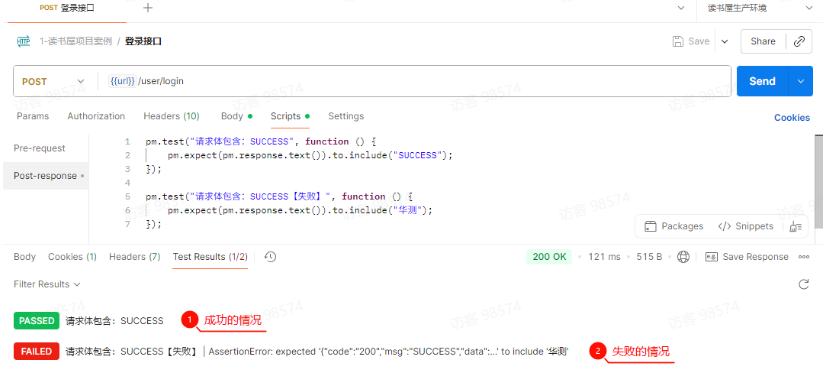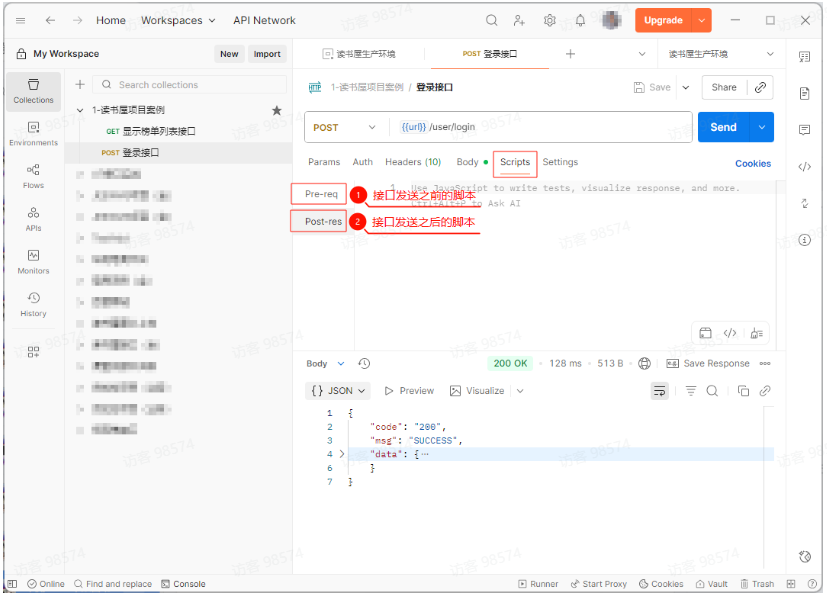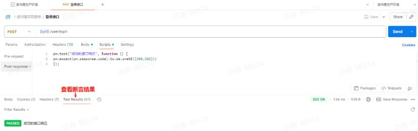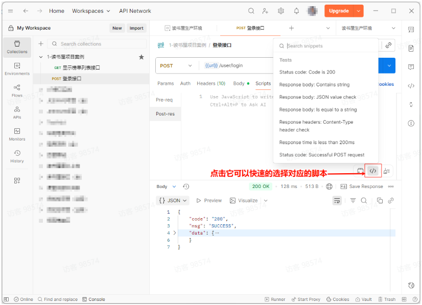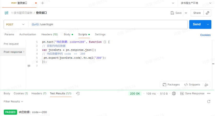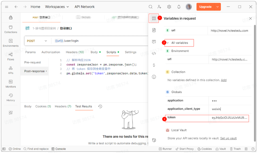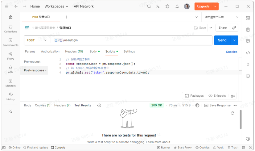 在 Scripts—Post-response 标签页中,不仅写断言,还可以提取数据并保存到环境变量或全局变量中。