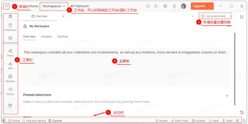 Postman的界面主要分为菜单栏、工具栏、请求管理区、环境管理区、请求设计区及底部状态栏,如下图所示。