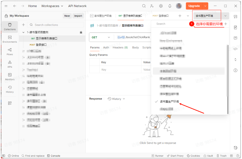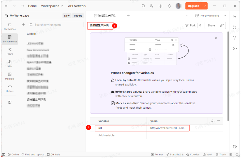 环境:点击环境眼睛图标 -> 点击环境名称 -> Export -> 导出为 读书屋生产环境.postman_environment.json。