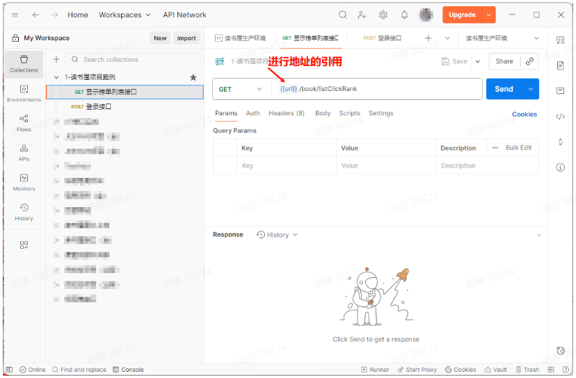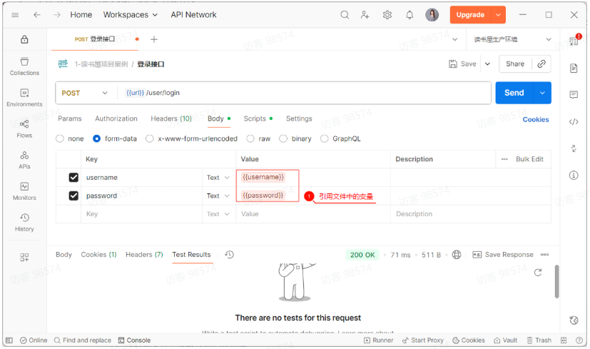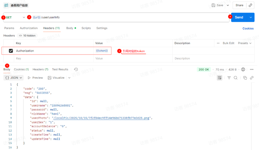 步骤3:在第二个接口的请求参数中(如 URL、Headers、Body),使用 {{变量名}} 语法引用保存的变量。