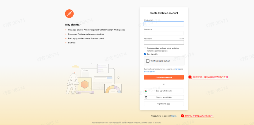 • 如果你已有 Postman 账户:直接登录。